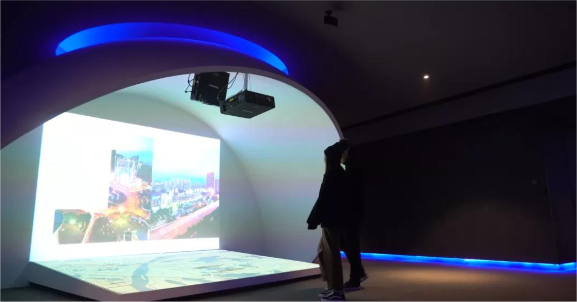 半球頂造型的L幕投影,以地幕+直幕聯(lián)動(dòng)的載體形式展示內(nèi)容,以超強(qiáng)臨在感帶給觀者影院級(jí)沉浸體驗(yàn),非常適合闡釋新世界T1所在區(qū)位的宏大背景。