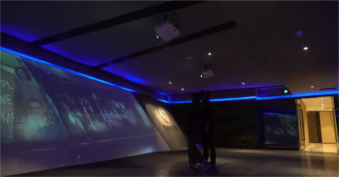 展廳入口采用傾斜墻面投影展示新世界品牌信息,利用現(xiàn)有空間的物理屬性,低成本打造視覺(jué)的自然延展;應(yīng)用于整個(gè)展廳的科技藍(lán)光帶,使整個(gè)觀展區(qū)域色調(diào)統(tǒng)一,且空間層次明顯。