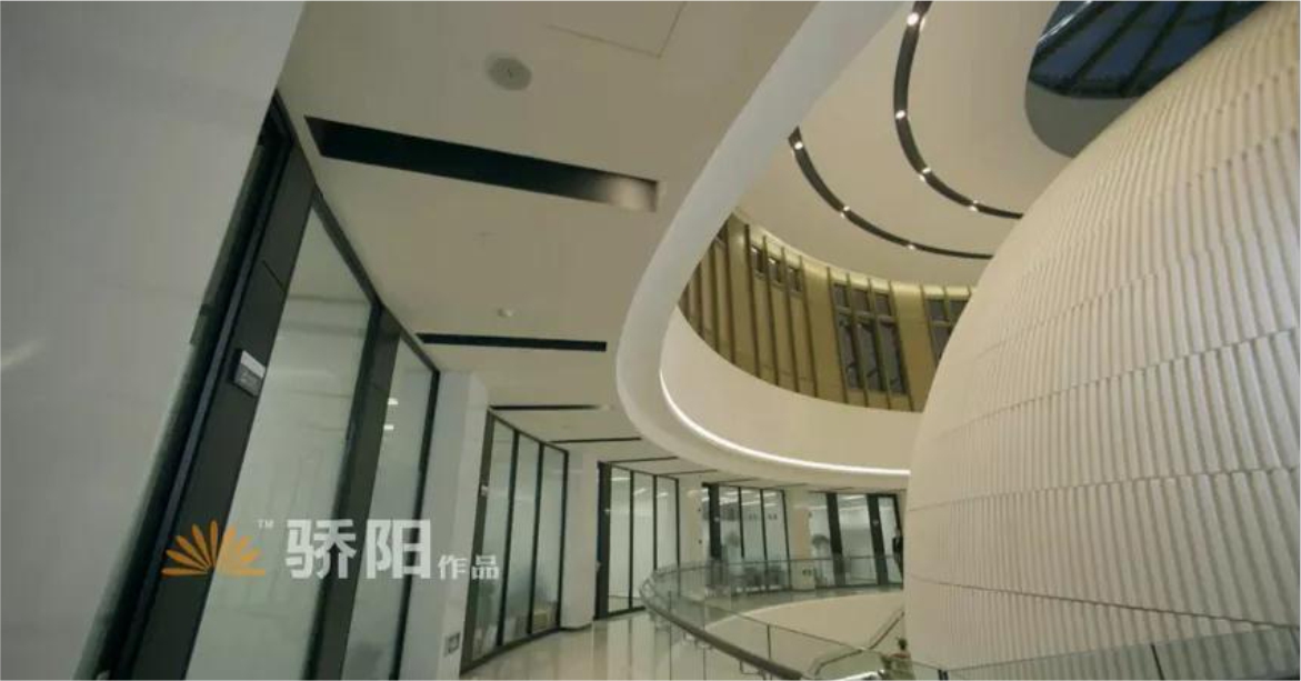 展廳內(nèi)大量使用圓形裝飾元素,通過(guò)圓的交錯(cuò)、層續(xù),使參觀者在遠(yuǎn)處目光即被吸引,空間景象靈動(dòng),視覺(jué)充滿張力,空間整體擁有更多想像外延。